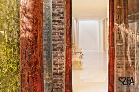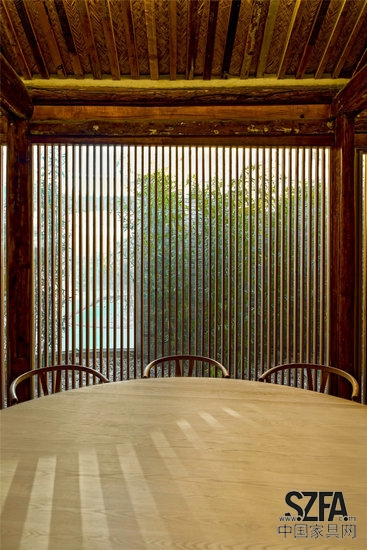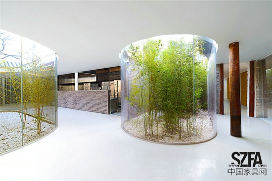 在傳統(tǒng)建筑中,廊是一種半內(nèi)半外的空間形式,它的曲折多變、高低錯(cuò)落,大大增加了游園的樂(lè)趣。猶如樹(shù)枝分岔的曲廊從室外伸展到舊建筑內(nèi)部,模糊了院與房的邊界,改變?cè)鹤哟舭濯M窄的印象。輕盈、透明、純白的廊空間與厚重、滄桑、灰暗的舊建筑形成氣質(zhì)上的反差,新的更新、老的更老,拉開(kāi)時(shí)間上的層疊,新與舊相互產(chǎn)生對(duì)話。曲廊在原有院子中劃分了三個(gè)錯(cuò)落的弧形小院,使每一個(gè)茶室有獨(dú)立的室外景致,在公共和私密之間產(chǎn)生過(guò)渡。曲廊的玻璃幕墻好似一個(gè)懸浮地面之上的弧形屏幕,將竹林景觀和舊建筑形式投射到茶室之中,新與舊的影像相互疊加。曲廊同時(shí)具有舊建筑的結(jié)構(gòu)作用,廊的鋼結(jié)構(gòu)梁柱替換了局部舊建筑中腐朽的木材,使新與舊“長(zhǎng)”在了一起。