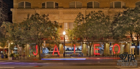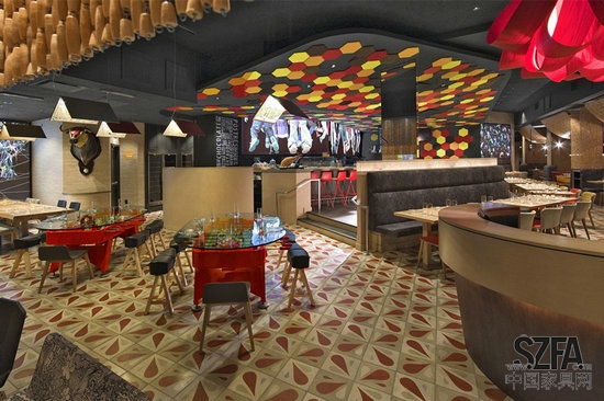 Jaleo是一個西語單詞,意為狂歡、歡樂、喧囂、嘈雜等等。這是個正能量滿滿、喜慶、美好的詞匯,也是新餐廳室內(nèi)設(shè)計(jì)背后的目標(biāo)。這個餐廳的設(shè)計(jì)是節(jié)日氣氛與餐廳主人José Andrés個性的融合,他是世界上最大膽創(chuàng)造佳肴的人。