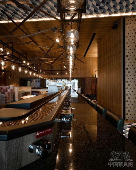 我們將這個店面想象為大海上一艘燈火通明的漁船,它有自己的航道、不曾迷失,那個引導返港的方向,就是海壽司的初心:用和諧簡約的調理,去尊重、品味、珍惜來自土地與海洋恩賜的食材。這個故事的主角、也是店內的靈魂所在,回轉臺,是那艘海上夜捕的漁船,燈火通明、勇往直前、充滿生命力。我們刻意選擇了類似油燈造型的吊燈,用序列的方式凸顯數(shù)量,讓空間被吧臺上的吊燈布滿,配合噴黑鐵架與鐵網,完整呈現(xiàn)古樸的美感。食客置身其中,抬眼看見的每一個面向,都是海壽司的浮世繪,不僅有層次,還有故事的想象延伸。