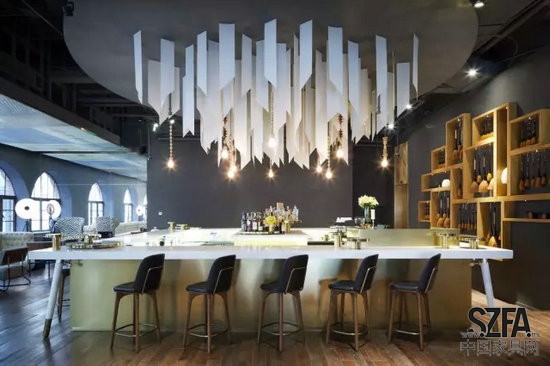 吧臺區(qū)域選擇亞洲傳統(tǒng)書法元素來點題。宣紙被裁剪成一條條斜邊紙條,從木制天頂優(yōu)美地垂落,幾條木吊燈配合氣場十足的黃銅吧臺桌,縱向?qū)用媪Ⅲw豐富。