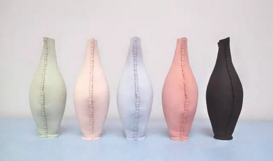 Charlotte對(duì)布藝情有獨(dú)鐘,即便是常規(guī)思維中不能以布料為材質(zhì)的物品,她仍會(huì)發(fā)揮想像,進(jìn)行極具視覺(jué)張力的布藝應(yīng)用嘗試。Stiched urn系列的縫紉花瓶便是一次視覺(jué)與觸覺(jué)的顛覆性探索。這個(gè)系列以注漿成型法鑄造瓶子的形狀,刻意的縫邊設(shè)計(jì)帶來(lái)手工制作的錯(cuò)覺(jué),多彩的釉下彩表面形成天鵝絨般的質(zhì)感,以假亂真的布藝花瓶平衡了柔和與堅(jiān)硬的矛盾屬性。