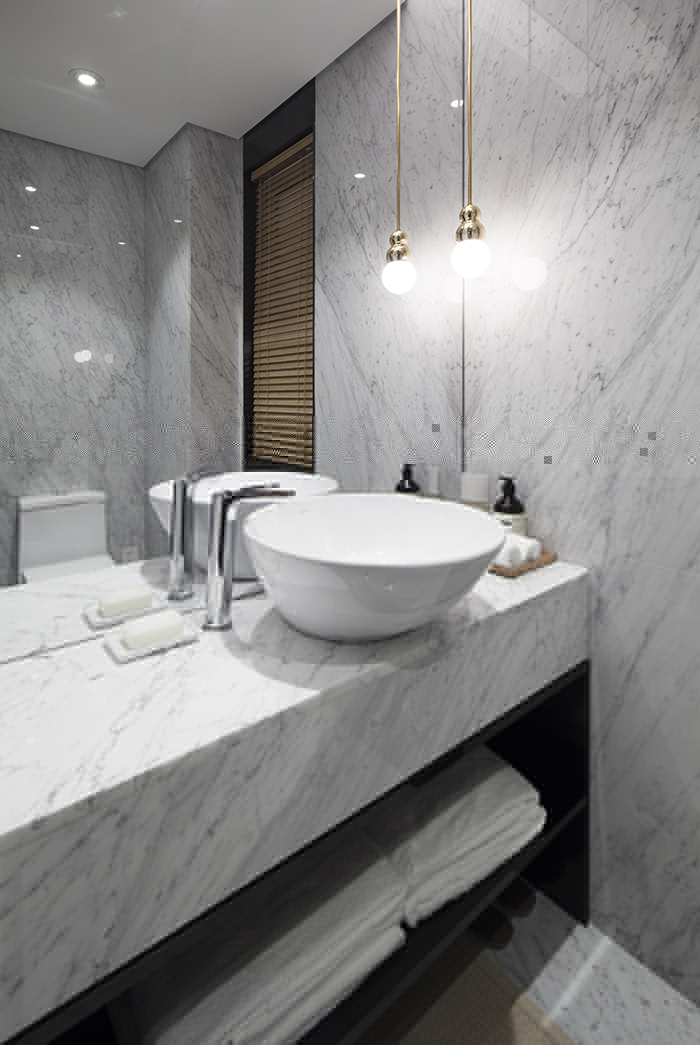 衛(wèi)生間沿用了客餐廳的大面石材,使空間更為統(tǒng)一。淋浴間和馬桶間分為兩個(gè)空間。為了提高空間利用率,淋浴間的門設(shè)計(jì)成石材暗門,從外面看與玄關(guān)區(qū)域融為一體,美觀又實(shí)用。
