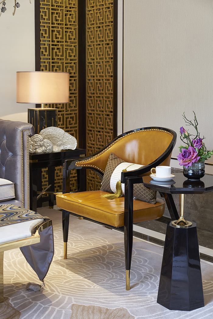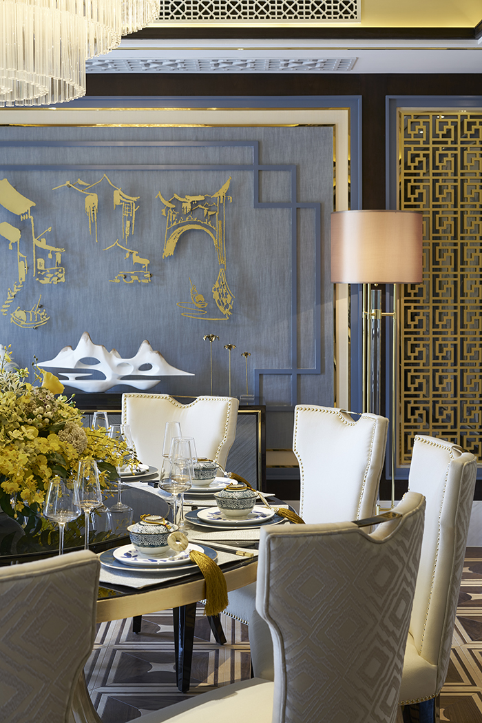 二層布局了兩個(gè)宴客空間,延續(xù)一層的格調(diào)卻又各有風(fēng)情。在當(dāng)代風(fēng)格之中,植入穩(wěn)定氣派的裝飾細(xì)節(jié),將古典韻味與現(xiàn)代設(shè)計(jì)進(jìn)行巧妙融合,空間充滿嚴(yán)謹(jǐn)和驕傲,透露出儀式感和稀缺感的力量,表達(dá)當(dāng)代中國(guó)藝術(shù)審美。