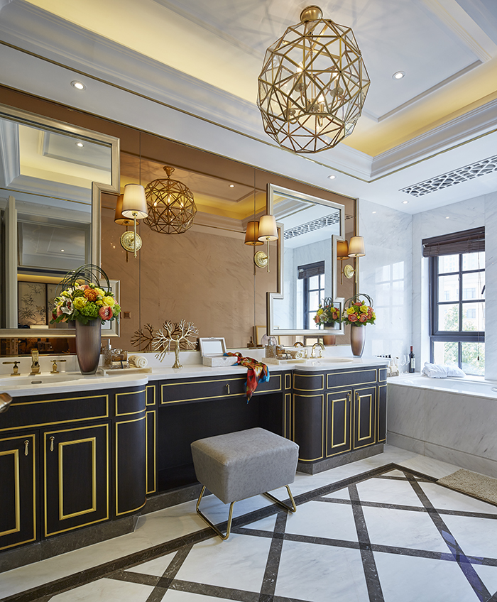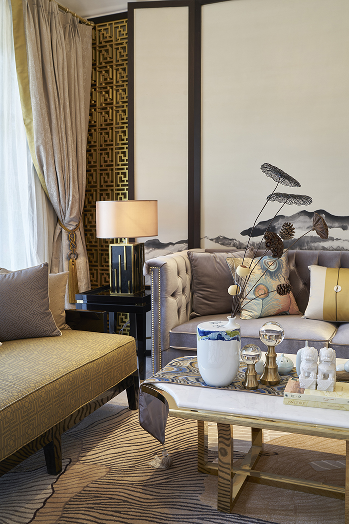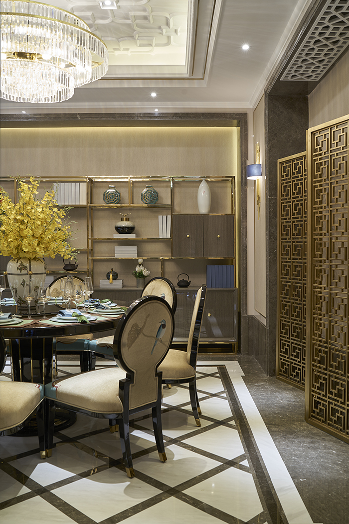 一層是客廳、餐廳和廚房。該層空間以素雅的白色和米色為主色調(diào),金色屏風(fēng)提升空間氣質(zhì),明亮的黃與清新的灰藍(lán)點(diǎn)綴其間,中西方元素的搭配與重組,構(gòu)筑出空間藝術(shù)氤氳的專屬格調(diào)??蛷d大尺度的落地玻璃窗將戶外綠意盎然的自然風(fēng)景引入室內(nèi),家具樣式的選擇以剛直挺拔的當(dāng)代風(fēng)格為主;而屏風(fēng)和裝飾畫(huà)卻代入中式風(fēng)情,以寫(xiě)意為理想,潑墨為主題,收放自如地詮釋了東方精髓;進(jìn)口的絲絨布料、水晶飾品與金屬的氣質(zhì)融合,演繹成空間的妙筆。餐廳的設(shè)計(jì)兼容了大戶宴客禮儀和文人情懷,在米色的基調(diào)中,璀璨的水晶吊燈、氣派的大理石圓桌、特別定制的餐椅、金屬屏風(fēng)及中國(guó)當(dāng)代瓷器、古玩在同一空間對(duì)話,隱喻獨(dú)到審美和氣度。