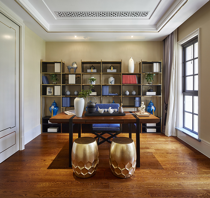 三層完備商務(wù)與生活功能區(qū),設(shè)置茶室、會(huì)議室和臥室。茶室的設(shè)計(jì)以新禪意的手法將東方的與西方的相碰撞并產(chǎn)生對(duì)話,極簡(jiǎn)的線條和淡雅的木色相搭配,具象地展示了更具緯度和深度的空間美學(xué),讓空間擁有無(wú)限的意境。臥室的雅致和美如影隨形,米色為主色,深藍(lán)色鋪陳其間,花鳥(niǎo)的墻紙向中式致敬,造型獨(dú)特的裝飾藝術(shù)擺件和花藝使整個(gè)臥室清雅迷人。