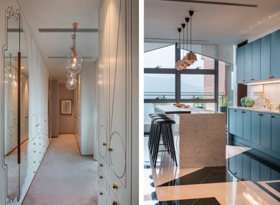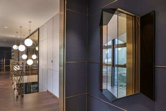 在設(shè)計(jì)的同時(shí),我們也非常注重于周圍環(huán)境的相互協(xié)調(diào)。坐落于高樓頂層的復(fù)式雅居,脫離著城市應(yīng)幽的喧囂繁雜,反之獲得的是如同擺脫塵世的安然自得,低調(diào)卻又不失華麗的生活色彩。Thomas  Dariel希望能夠講這一種生活理念通過(guò)設(shè)計(jì)來(lái)傳遞。空間中反復(fù)出現(xiàn)的幾何線條,高雅深邃的藍(lán)色及綠色宛如窗外景色一般,青山,藍(lán)天。相互輝映。這些存在于空間中的點(diǎn)滴細(xì)節(jié),無(wú)一不訴說(shuō)著一種沉靜,一種雅致。