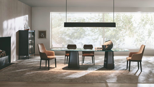 基礎幾何圖案結合的數(shù)學實踐,構建出了新的幾何實體。即便是諸如Rodolfo Dordoni這一類最謹慎的設計師,也依舊通過這一方式開展實踐,針對原創(chuàng)家具的構思和使用,賦予其生命和活力。Mayfair系列的餐桌、小書桌和桌板下方,采用了梯形或截頭棱錐形狀的支柱式底座。桌子產品的底座表面為拋光銅或灰色東方大理石飾面。小書桌產品的底座表面為白煤或赤褐色亮面涂漆。橢圓形或方形桌面的面板采用弧形邊緣,材質采用灰色桉樹或透明夾層 玻璃,而支撐柱則準確的定位在底座的上方。小書桌的橢圓邊緣桌面放置在梯形基座上。