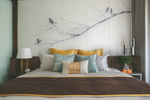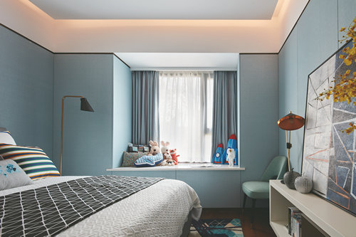 很多時(shí)候,我們只需要一幅簡(jiǎn)單有力量的掛畫來(lái)豐富空間內(nèi)涵。好的設(shè)計(jì),既是融合的又是獨(dú)立的。譬如,主臥的設(shè)計(jì)自成一格,中式韻味頗濃,但在細(xì)節(jié)處卻可以看到與客廳的呼應(yīng),明黃色的抱枕、金屬吊燈、綠植盆摘、單椅的造型都能再客廳覓得影子。兒童房則跳脫出風(fēng)格的籬藩,賦予主題,故事,個(gè)性,喜好,是對(duì)于童年夢(mèng)想的小小滿足。