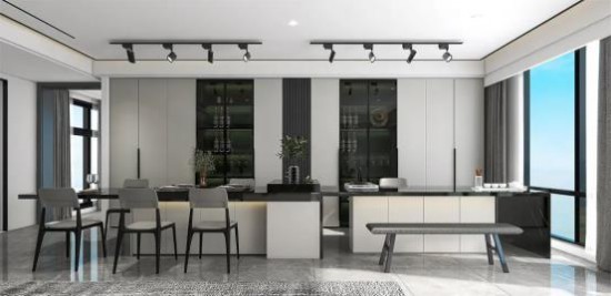 協(xié)調(diào)整體空間比例,客餐廳一體打造通透開(kāi)闊的視覺(jué)效果。選用無(wú)色系的黑白灰鋪染空間氛圍,吊燈處零星分布的射燈點(diǎn)綴,多一份溫柔質(zhì)感。