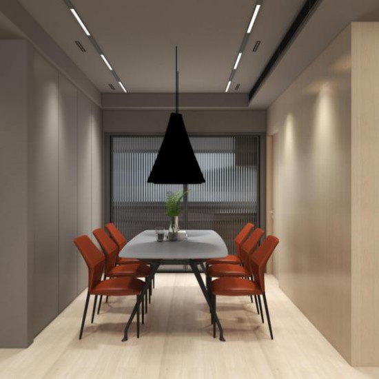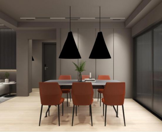 用餐區(qū)與廚房間以長(zhǎng)虹玻璃隔斷,增強(qiáng)空間的互動(dòng)性,方寸之間,充滿(mǎn)活力暖橙色的餐椅106將空間氛圍感拉滿(mǎn),豐收美滿(mǎn)的寓意,平凡生活里的煙火氣。