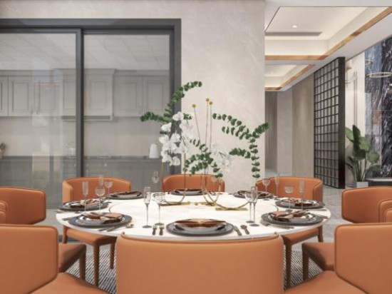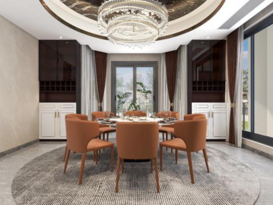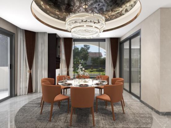 圓形吊頂與豪華燈飾演繹現(xiàn)代輕奢風,獨特的造型顯現(xiàn)藝術質(zhì)感,柔和光感,照亮用餐空間。