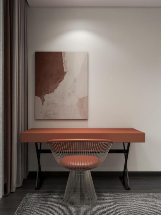 空間整體秉承極簡風的裝飾設計,觀感素雅簡凈,拱形窗戶增強藝術質(zhì)感,呈現(xiàn)淡淡的法式優(yōu)雅,精致感十足。簡易書桌臺靜立于室,豐富空間的功能性。