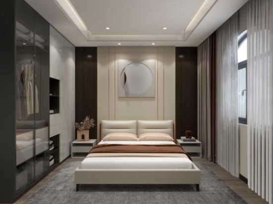用豐富的設計手法豐富極簡的空間結構,次臥主打灰咖色調(diào),雅致柔和,奠定了舒緩的睡眠氛圍。